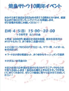 おかげさまで2026年4月で10周年ということで、立ち飲みスタイルのイベントを開催します!10周年くらいは盛り上げたいのでどうか!どうか!皆様お越し下さい🙏よろしくお願いします!!🙇🙇🙇
